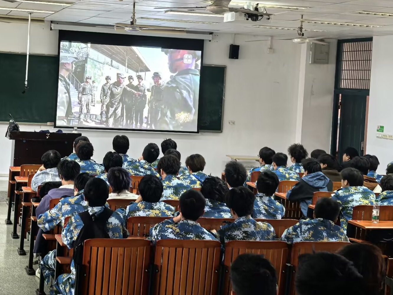 在艺术展报活动中,新生们围绕“家国情怀”“军训感悟”等主题踊跃创作,绘画作品意境鲜活、手抄报图文并茂,每幅作品不仅凝聚着新生对青春的诠释与对未来的期许,更展现出保家卫国的责任与爱国爱党的情怀。在军训留言板前,同学们提笔写下的不仅是训练心得,更是对自身的肯定,其中一句句真挚话语串联起军训中的温暖瞬间,成为定格青春记忆的珍贵载体。观影活动则带来深刻的精神洗礼,学校精选《必胜》这一励志影片,影片中所有人为目标不懈奋斗、迎难而上的拼搏精神深深的感染了在场的每一位同学,进一步坚定了大家克服困难勇担青春使命的信念。