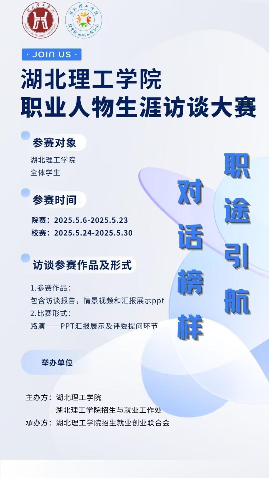 此次 “职业人物生涯访谈大赛” 不仅是对同学们实践能力的一次检验,更是他们探索职业发展道路的重要契机。经过层层选拔,孟银双,费圣鹏,周佳丽,彭晶,陶睿瑶,张雨绮,吴寒以上7位同学凭借扎实的专业知识、出色的访谈技巧和对职业规划的深刻理解脱颖而出。期待他们在校赛中以更饱满的热情、更专业的表现,带来精彩的职业故事分享,也希望全院学子能以他们为榜样,积极探索职业方向,在未来的职业道路上乘风破浪。(通讯员 王雪怡 王潇)